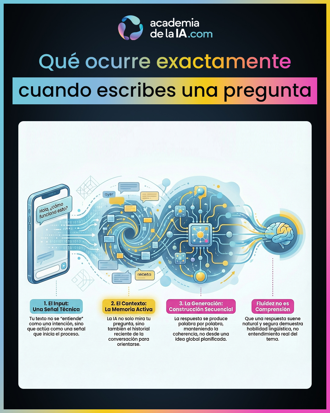 Aquí vas a ver qué pasa exactamente desde que escribes una pregunta hasta que aparece una respuesta. No como metáfora, sino como proceso: tu input entra en un sistema, se prepara, se combina con el contexto disponible y se genera una salida paso a paso. Esto aclara por qué la formulación importa tanto, por qué dos preguntas parecidas pueden producir respuestas muy distintas y por qué la fluidez puede engañar: el sistema está optimizado para coherencia y continuidad, no para “comprensión” humana.