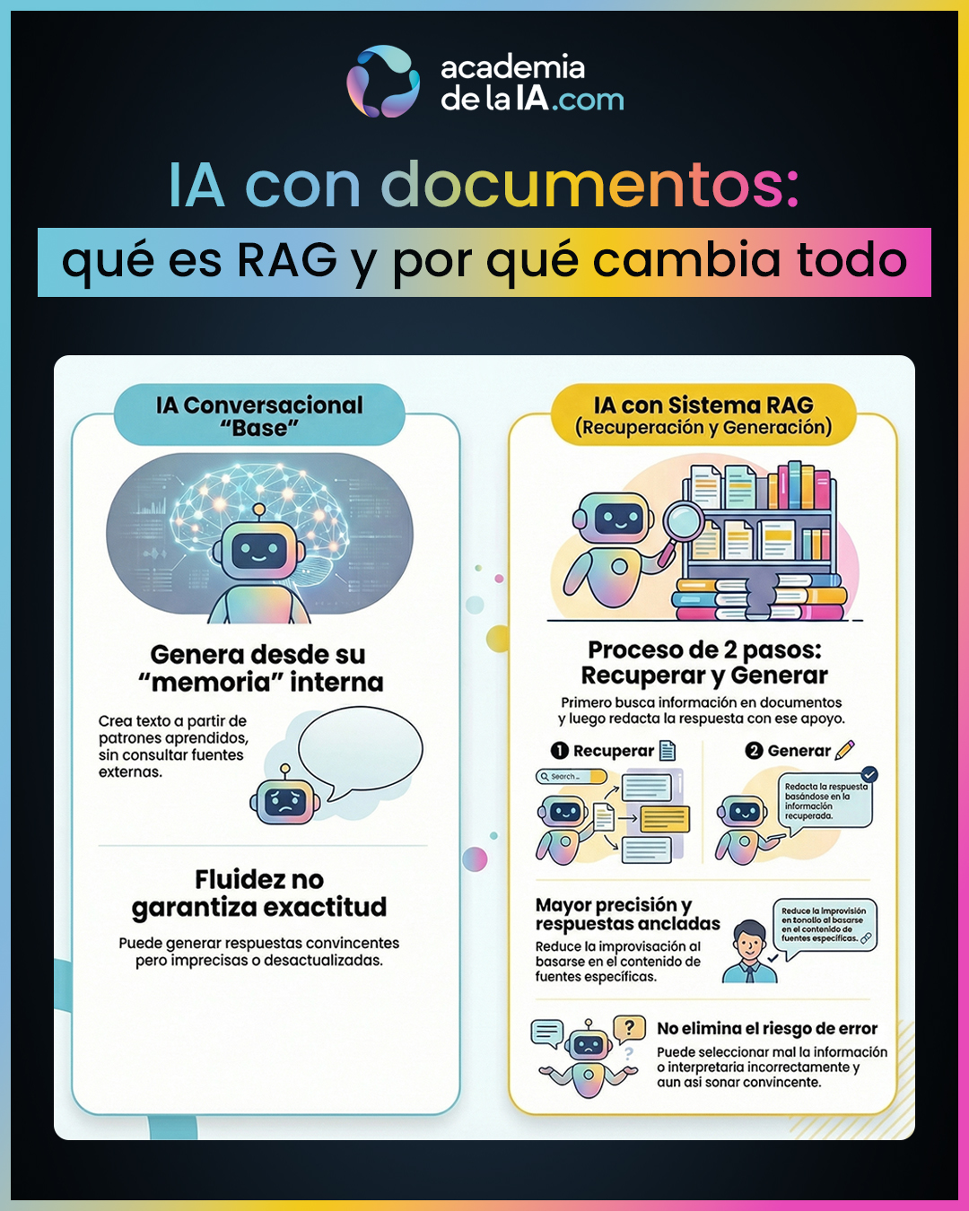 - RAG introduce un apoyo externo, no una “inteligencia mayor”. El sistema no se vuelve más listo en ese momento: simplemente añade un paso previo en el que recupera información relevante y luego genera la respuesta apoyándose en ella.