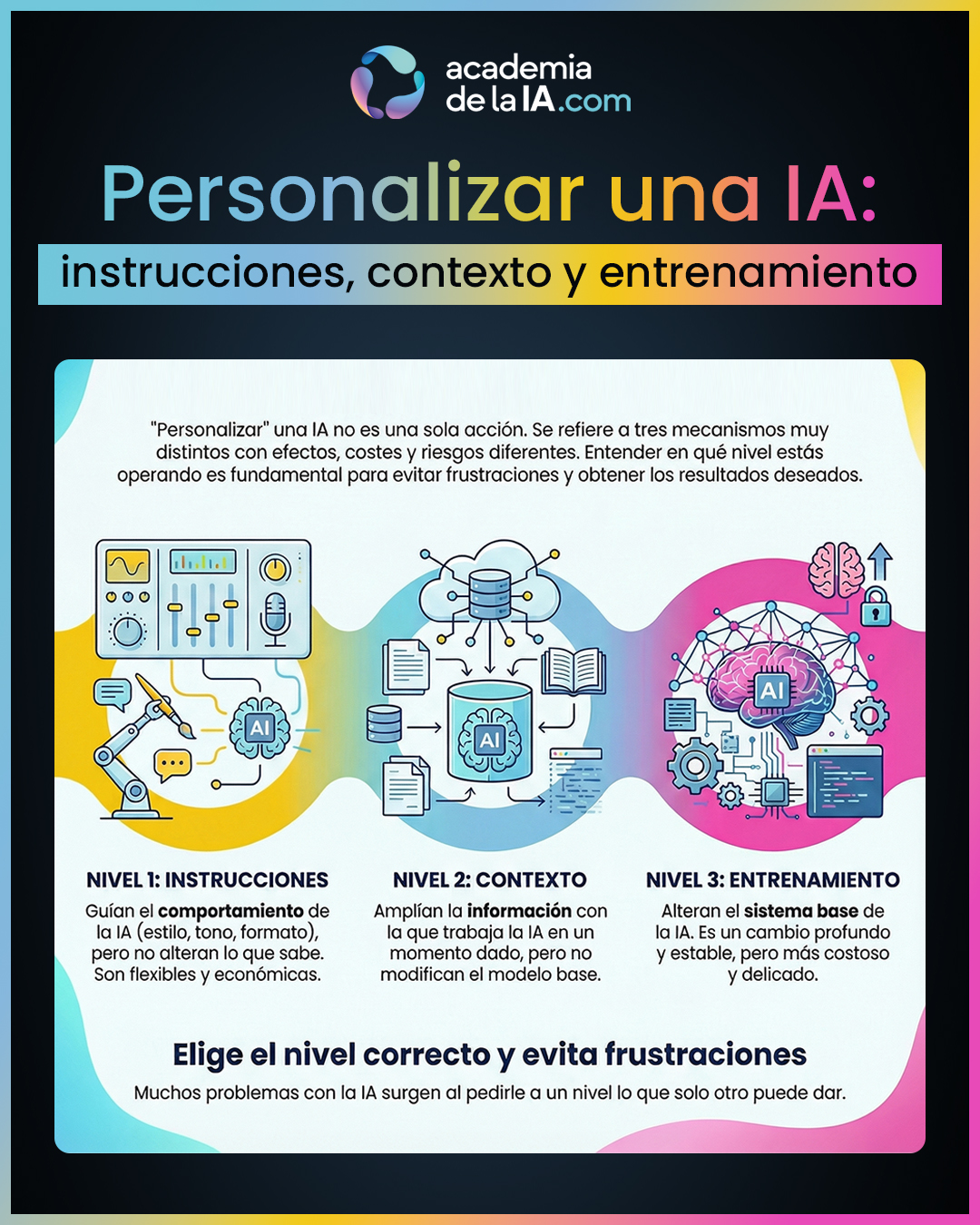 El cierre subraya una idea clave para evitar frustraciones: muchos problemas con la IA no vienen de la tecnología, sino de no saber en qué nivel de personalización se está actuando. Y deja preparado el terreno para el siguiente capítulo, donde se introduce un factor que atraviesa todos los niveles: la calidad de lo que el usuario comunica.