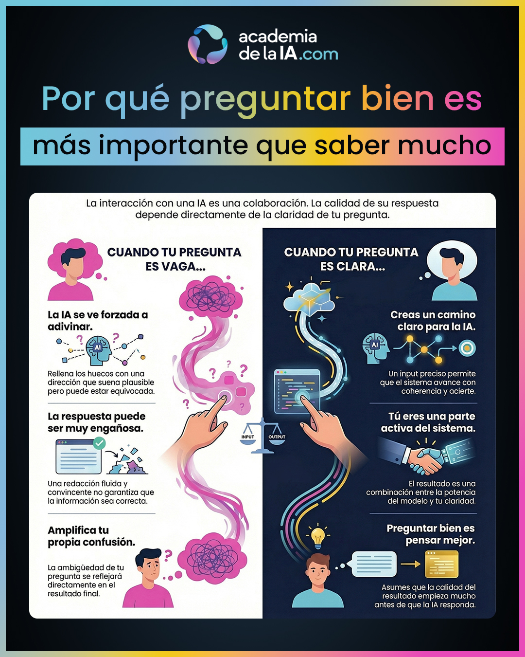- La IA no sustituye tu pensamiento. No corrige automáticamente una pregunta confusa; amplifica tanto la claridad como la ambigüedad que le das.