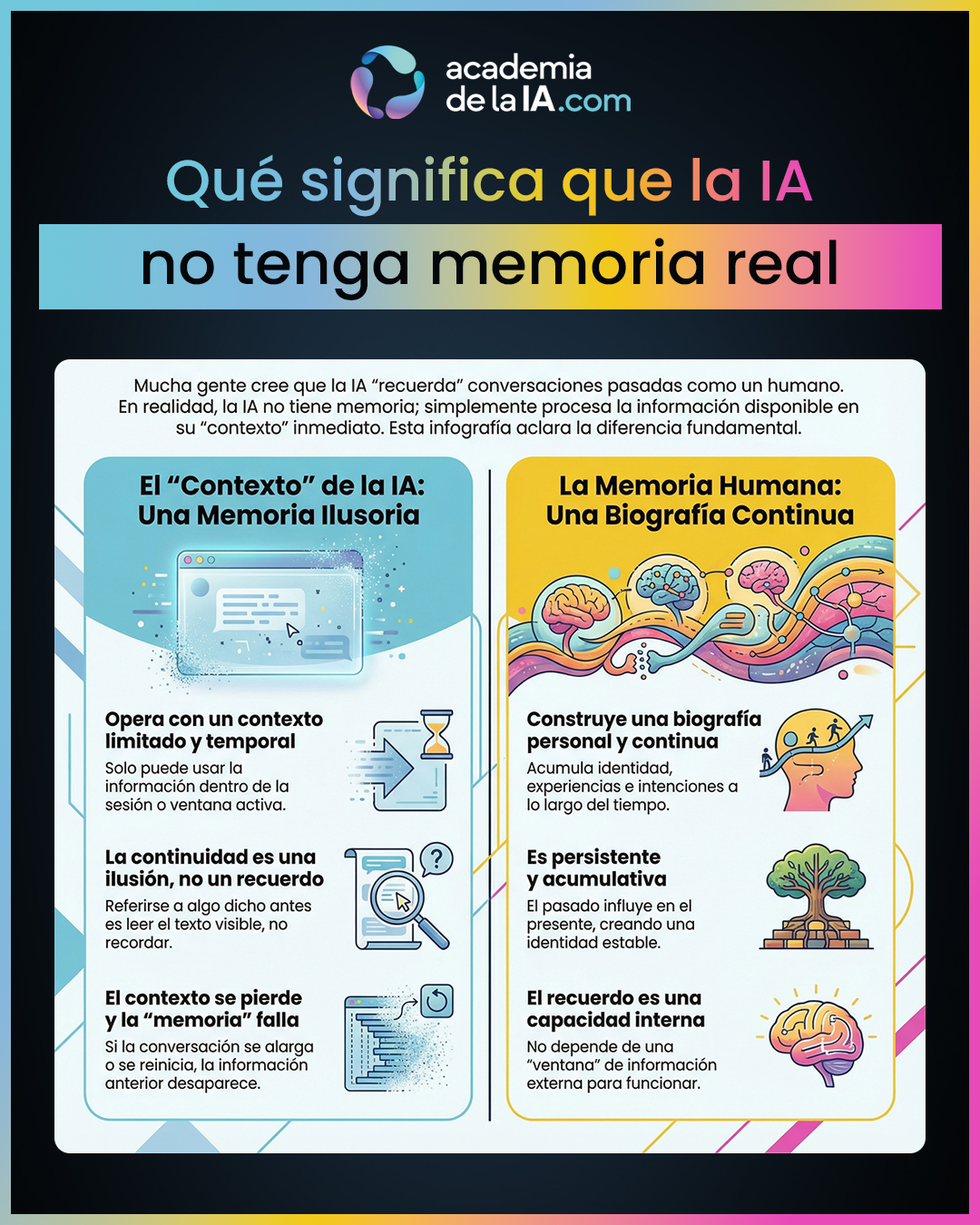 - Memoria humana y contexto operativo no son lo mismo. La memoria humana mantiene continuidad personal; la IA solo opera con información momentáneamente accesible.